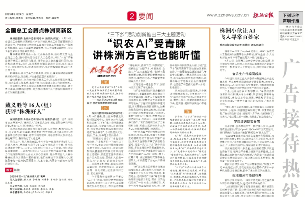 “识农AI”登上《株洲日报》头版要闻——支持全国200多种方言,株洲方言识别获农户好评