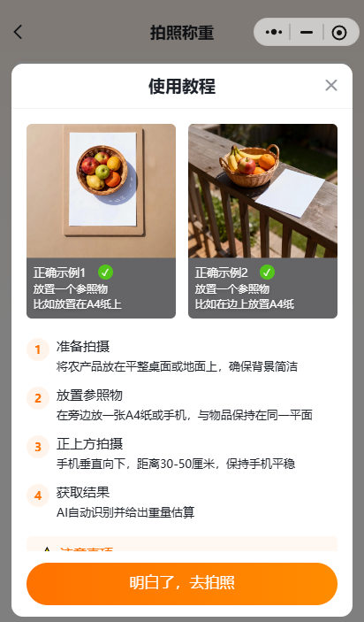 水果蔬菜拿起手机拍一下,AI自动估重,省时省力。