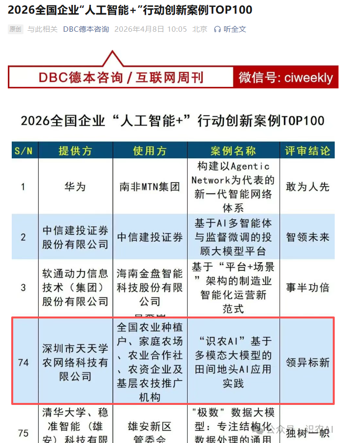 近日,由DBC德本咨询发布的“2026全国企业‘人工智能+’行动创新案例TOP100”榜单正式揭晓。在这场聚焦产业实战场、关注真实场景价值的权威评选中,深圳市天天学农网络科技有限公司凭借「“识农AI”基于多模态大模型的田间地头AI应用实践」强势登榜,并荣获“领异标新”的评审结论!