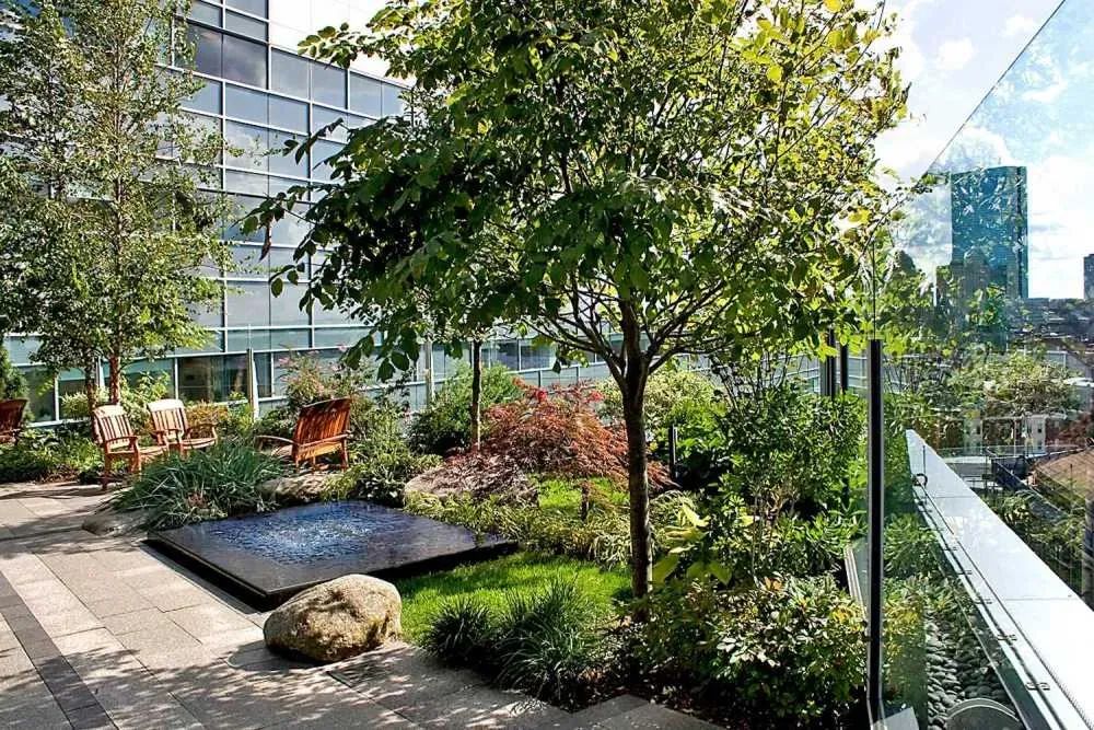 动态水墙:花园中央设置了一面水墙,水流的声音有助于缓解焦虑和压力,同时为花园增添了动态元素。