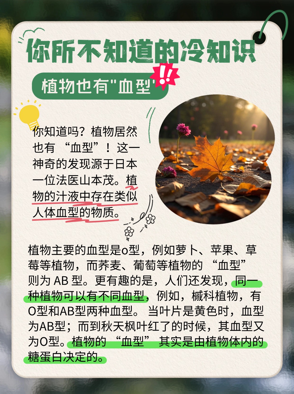 🍃植物竟有 “血型”!其汁液里有类似人体血型的物质,主要是 O 型。同一植物还能有不同血型,像槭科植物,就有 O 型和 AB 型。这 “血型” 由植物体内糖蛋白决定哒。