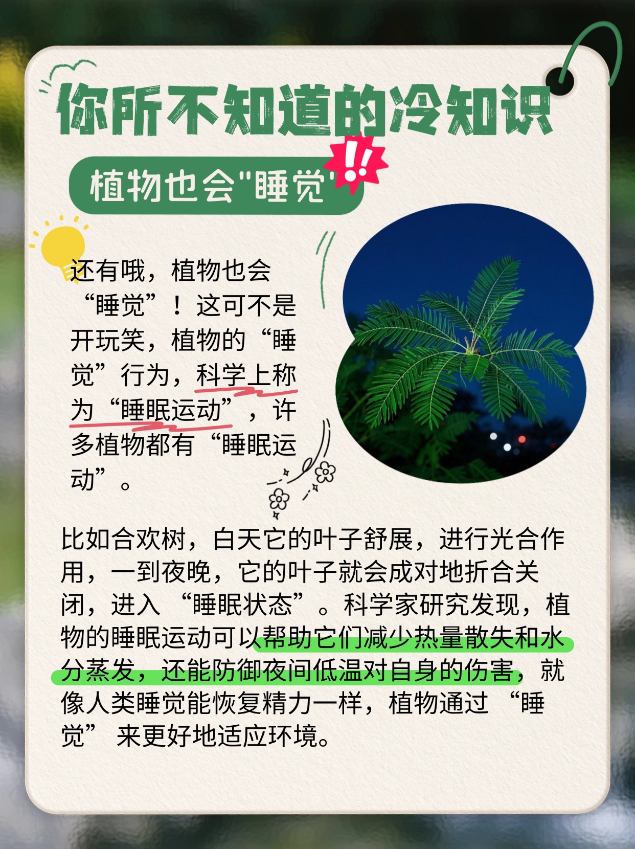 😴植物也会 “睡觉” 哦!好多植物都有 “睡眠运动”,能减少热量散失、水分蒸发,防御低温,跟人睡觉恢复精力一样,是为了更好适应环境。