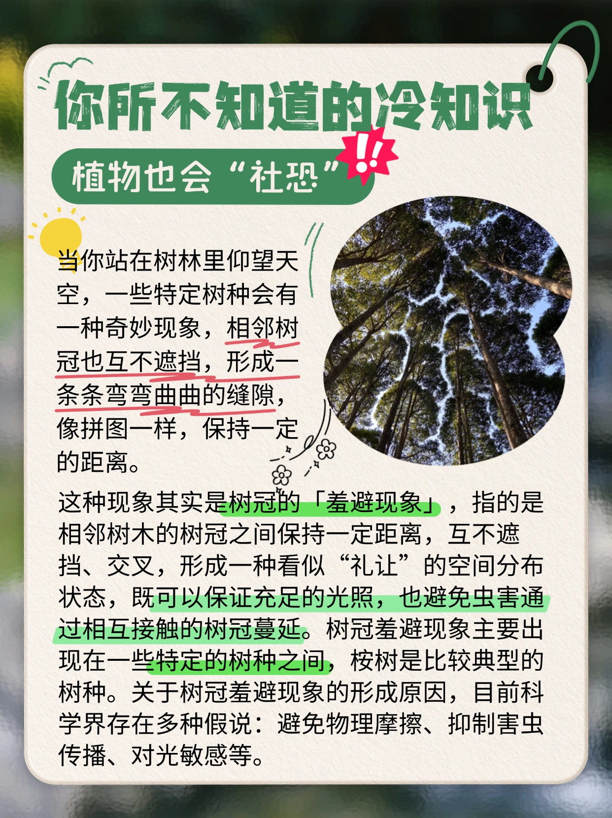 🌳植物也会 “社恐”。在树林里看天空,特定树种的相邻树冠互不遮挡,有弯弯缝隙,像拼图,保持距离,这是树冠「羞避现象」,既保证光照,又防虫害蔓延。