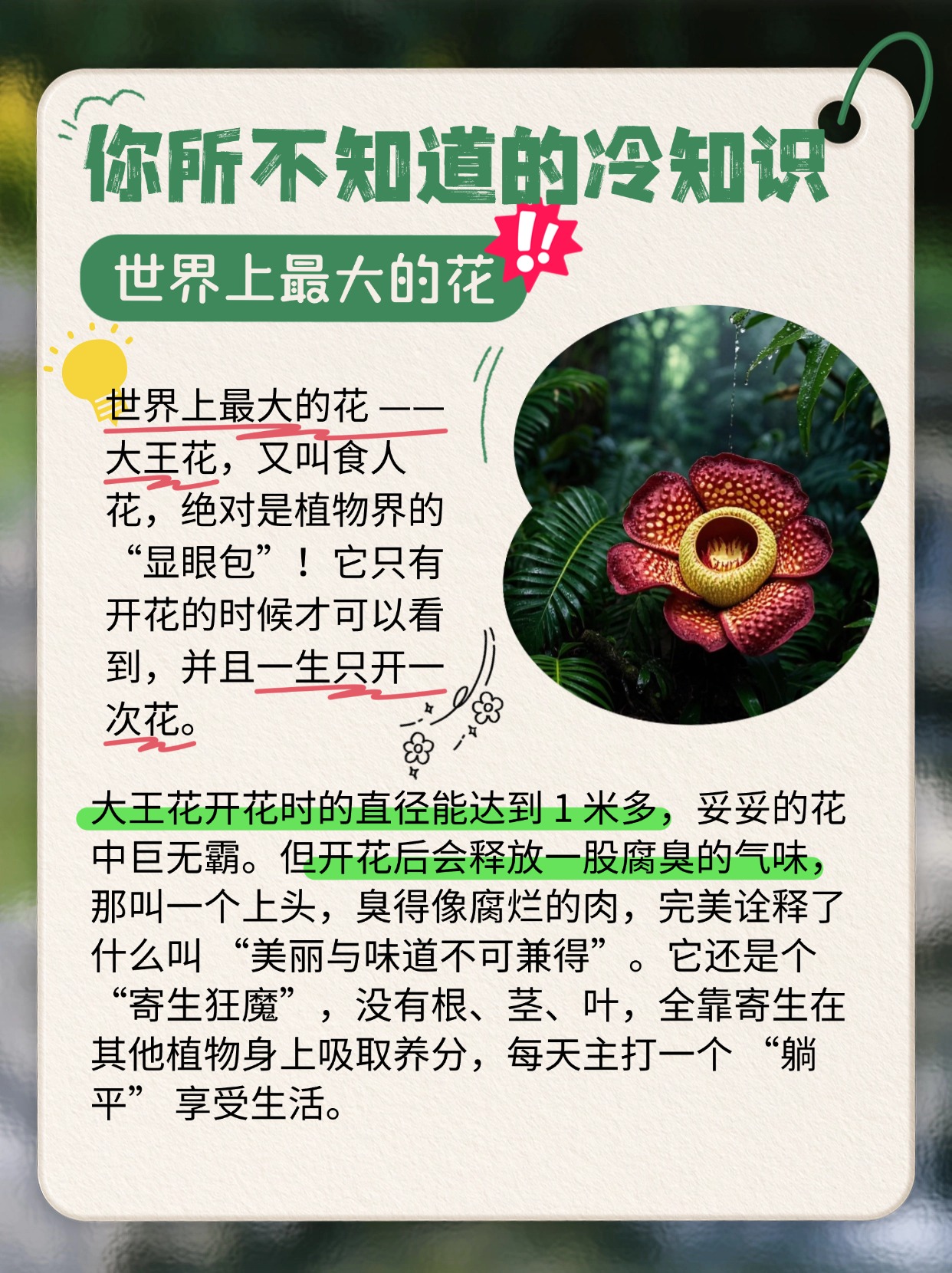 🌺大王花,植物界 “显眼包”!又叫食人花,一生只开一次花,开花才现身,直径超 1 米。但那味道,跟腐肉一样上头。