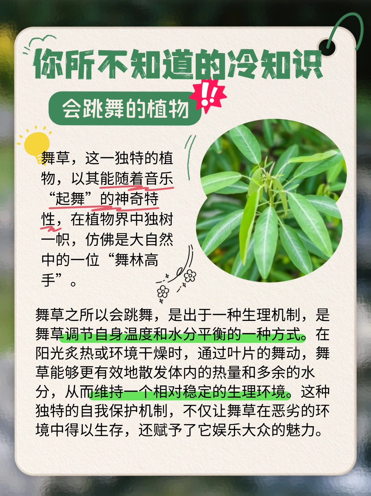 💃舞草,植物界 “舞林高手”,能随音乐 “起舞”,是它调节温度和水分平衡的生理机制哦。