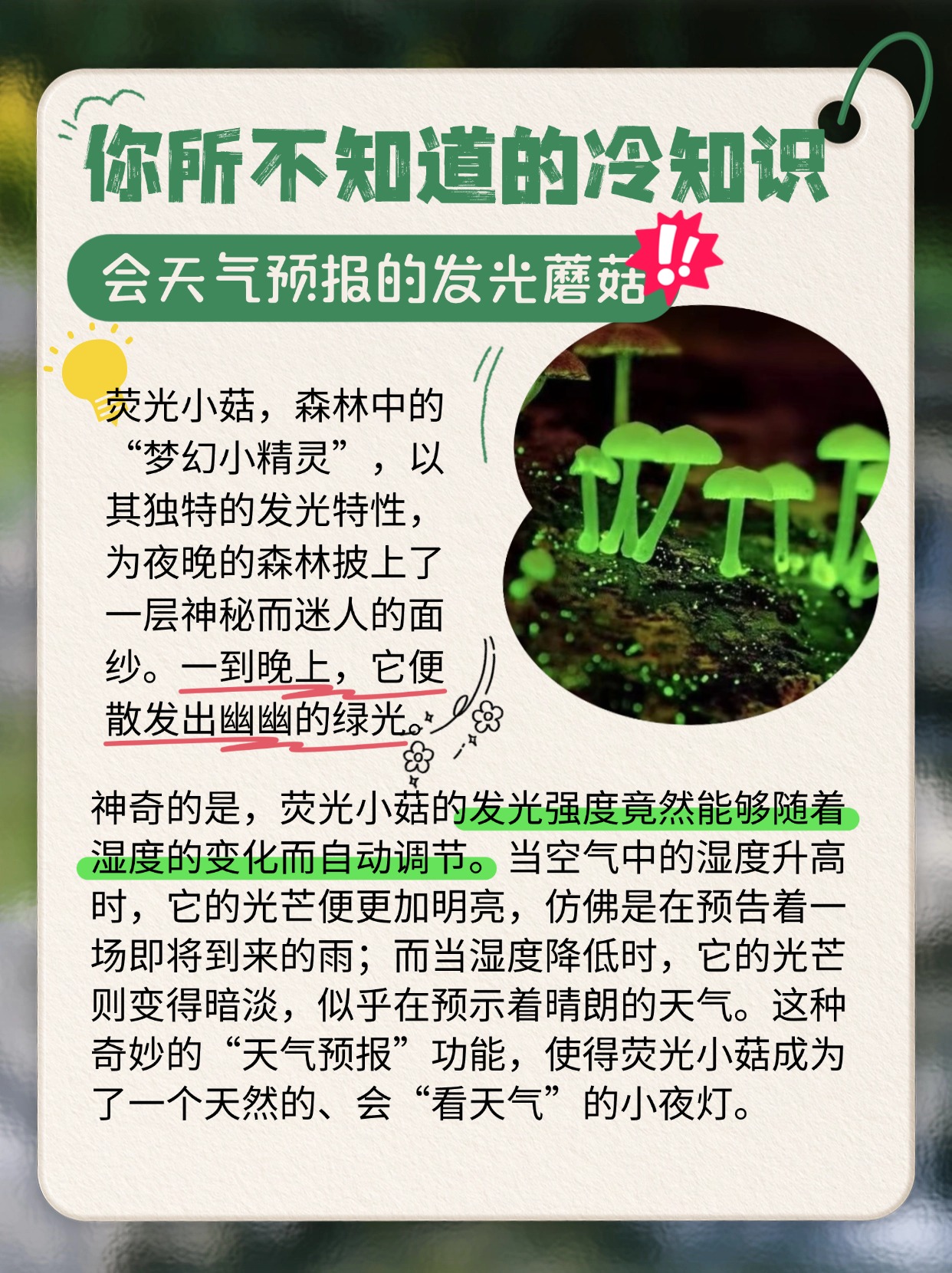 🌟荧光小菇,会 “天气预报” 的发光蘑菇。晚上散发幽幽绿光,发光强度还能随湿度变化调节。