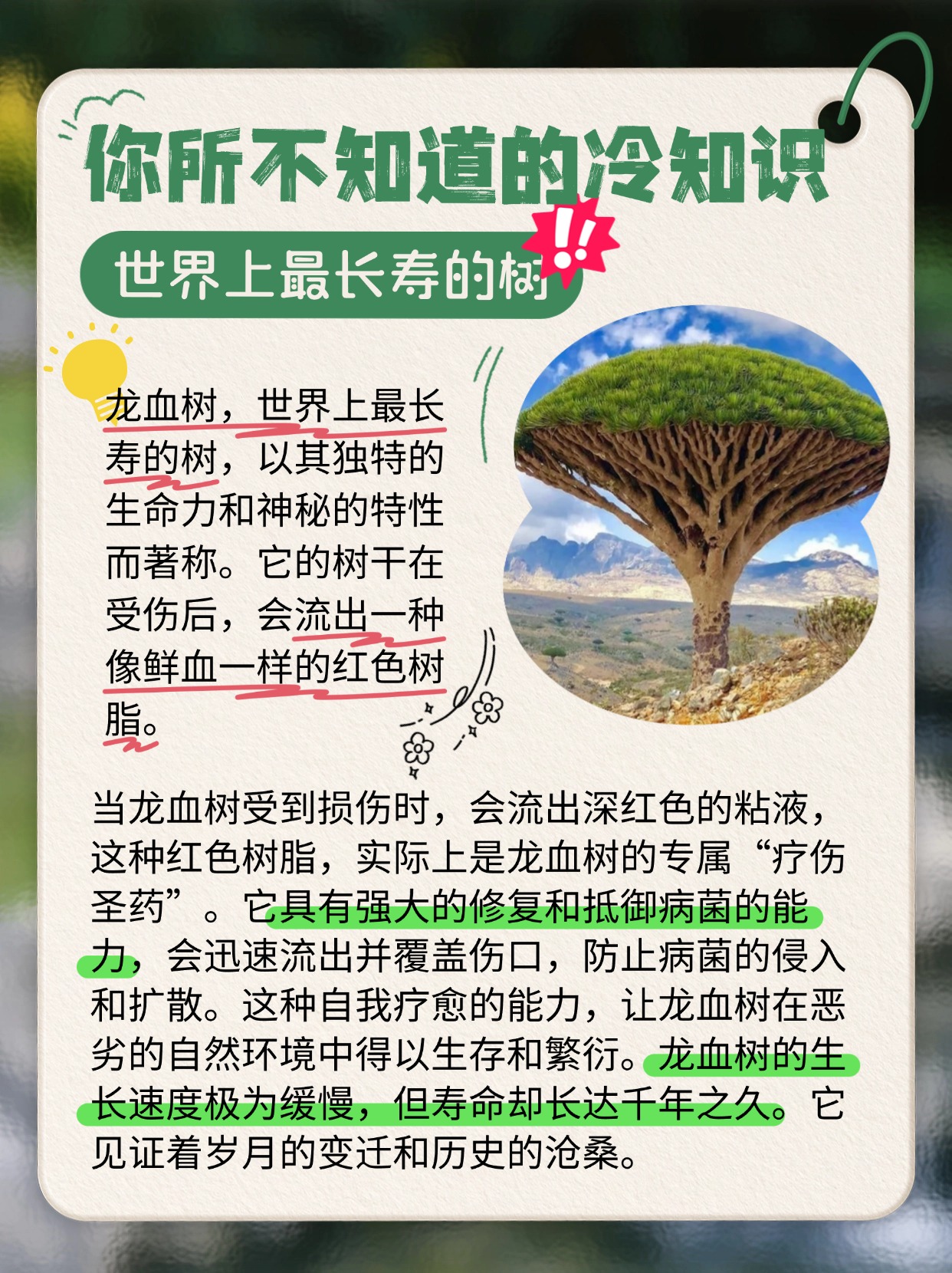 🌲龙血树,最长寿的树。树干受伤流 “鲜血”,其实是 “疗伤圣药”,能迅速覆盖伤口,防病菌侵入扩散。